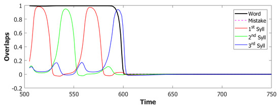 Stability would also be maintained if attractors were exceedingly “deep”, that is, if the local feedback w were strong enough to overcome the effects of the rising thresholds. Subsequently, the thresholds would stabilize at the asymptotic values and , and the input variables ’s would satisfy the asymptotic system , where both the ’s and ’s are functions of the ’s, hence of the ’s through Equations (2) and (3). Away from those limit cases, adaptation and slow inhibition tend to destabilize memory attractors. The one state that is guaranteed to remain stable, though, provided the constant threshold U takes a positive value, is the “global null state”, where all active states take low values, vanishing exponentially with , and (the exact values depend on and U).