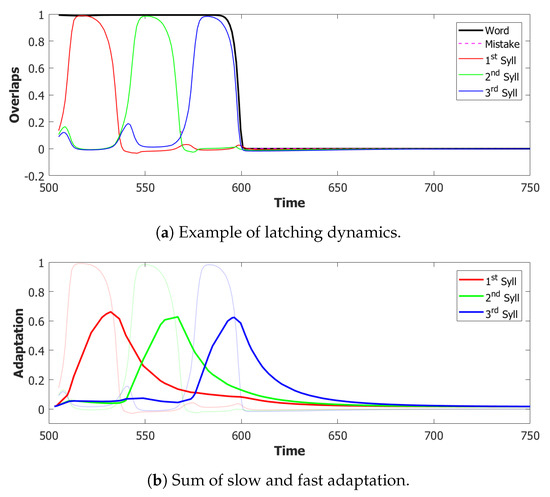When the Potts model is studied as a model of cortical dynamics, is written as , where U is a common threshold acting on all units, and is the threshold component specific to unit i, but acting on all its active states, and varying in time with its own time course. This threshold is intended to describe local inhibitory effects, which in the cortex are relayed by at least three main classes of inhibitory interneurons [98] acting on and receptors, with widely different time courses, from very short to very long. To simplify the analysis, we write and assume the component to be very fast, and the very slow, both being driven up by recent activity in patch i. As discussed elsewhere [99], the dynamical behaviour of the Potts model is complex, different in distinct regions or phases of parameter space. It shows latching dynamics in a wider region, if both inhibitory fast and slow components are included. Therefore, we write, for the time evolution of the network