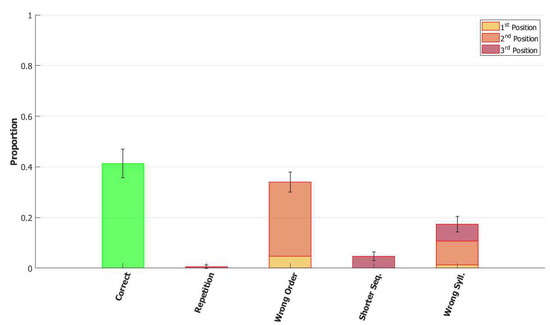 Haluts [54] also tested ISL signers in repetition and production of sentences containing function and number signs, and sign language unique morphologically complex structures, such as morphological facial expressions and classifier constructions. Morphological facial expressions are facial expressions that denote adjectives or adverbials, which occur together (simultaneously) with the sign and act as its modifiers. Classifiers are specific handshapes that denote groups of objects with some shared (physical or semantic) properties, which can be used together (simultaneously) with specific verbs to express movement or relative locations of objects. In repetition and production of sentences with these structures, the signers with low POB capacity made significantly more whole-unit errors, substituting one unit with another of the same category, just like the pattern seen in spoken languages: morphological affixes with other morphological affixes, function signs with other function signs, and number signs with other function signs. This was true despite the differences in the types of morphological affixes due to the different modality.
