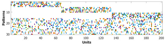 One can adopt the perspective suggested by Valentino Braitenberg [89,90] by using Potts units, introduced in statistical physics in 1952 [91], to represent local cortical networks, that is, patches of real neurons, each patch taken to be endowed with its set of dynamical attractors, which span different directions in activity space. These states are identified with the states of the corresponding Potts unit, defined as pointing each along a different dimension of a simplex. Potts networks have been studied by [92,93,94,95], not as a model of the cortex, but rather as an interesting generalization of a Hopfield binary network [96], in which units are just binary variables, either active or quiescent. One can formally regard such a generalization still as an autoassociative network, but of N Potts units interacting through tensor connections. Long-term memories are stored in the weight matrix of the network and they are fixed, reflecting an earlier, possibly protracted learning phase [96]. Each memory is a vector or list of the states taken in the overall activity configuration by each unit i: . We take each Potts unit to have S possible active states, labelled e.g., by the index k, as well as one quiescent state, , when the unit does not participate in the activity configuration of the memory, which occurs with probability . Therefore, , and each can take values in such abstract categorical set. The simil-Hebbian tensor weights read [92,97]