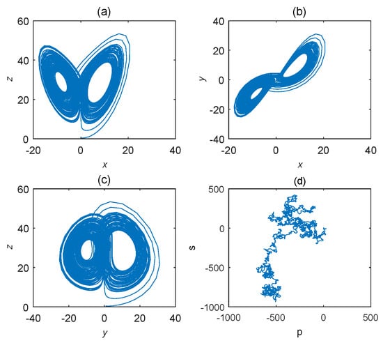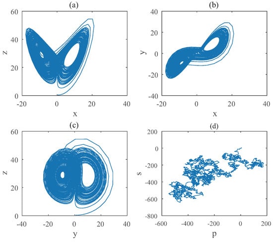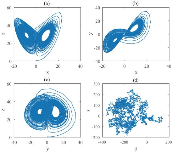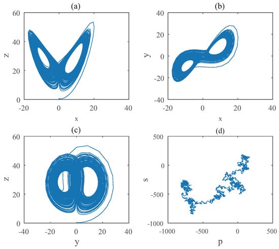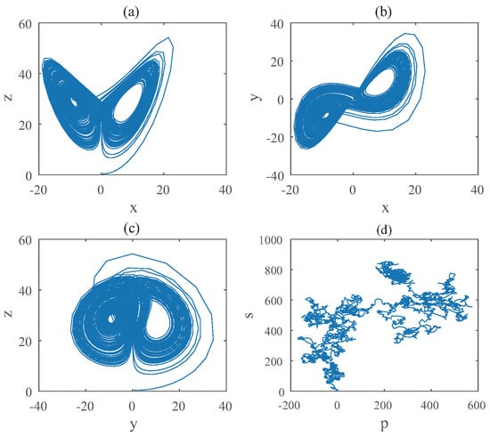 For Equation (9), the bifurcation diagram is shown in Figure 3. From the diagram we can get that the chaotic domain appears in . And the 0-1 test diagram and phase pictures of are shown in Figure 4, which indicate the existence of chaotic area. In this case, the is and is , approximately.