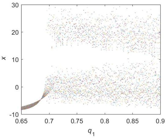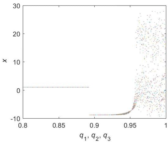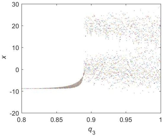 The basic form of complete fractional Lorenz system is shown in Equation (16). To compare with hybrid Lorenz systems, bifurcation diagram of complete fractional Lorenz system () is also obtained in Figure 13. If it exists , the chaotic domain is appeared in . It is in accordance with Reference [17]. Namely, the lowest is and the lowest is .