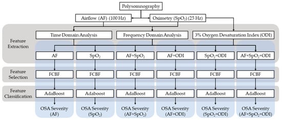 In this study, AF and SpO2 signals extracted from 974 PSG recordings were analyzed. AF signals were sampled at fs = 100 Hz, while SpO2 signals were obtained from the pulse oximeter at fs = 25 Hz, as recommended by the AASM [14]. Figure 1 shows the workflow of the proposed methodology. After preprocessing, features were extracted using time and frequency-based analyses. This study was intended to assess the complementarity of the features extracted from AF and SpO2 signals, and therefore different feature sets were assessed: AF-derived features, SpO2-derived features and both AF and SpO2 features. We also split the experiments in two situations: with and without ODI 3%. Six settings were thus investigated, namely: ‘AF’, ‘SpO2′, ‘AF + SpO2′, ‘AF + ODI’, ‘SpO2 + ODI’ and ‘AF + SpO2 + ODI’. Feature selection was conducted in these feature sets independently to establish optimum subsets of features before the classification stage. Finally, the selected features were used to train and evaluate six independent AdaBoost classifiers.