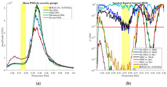 (a) Mean Power Spectral Densities of AF signals for each Obstructive Sleep Apnea (OSA) severity group. (b) Definition of the spectral Band of Interest (BOI).