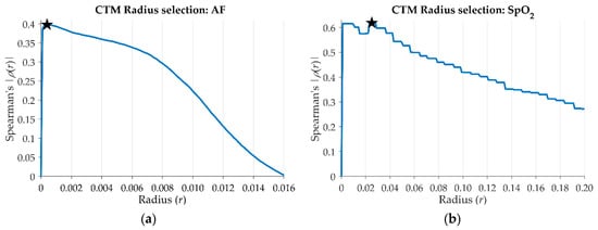 The computation of CTM relies on the parameter r. The values of r were independently set for AF and SpO2 signals by maximizing the absolute value of the Spearman’s correlation coefficient (ρ) between CTM and the AHI in the training set [26,31].
