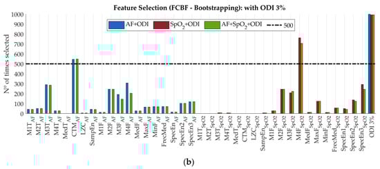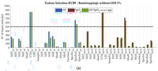 Figure 4 shows the histograms of the number of times each feature was selected using different groups of features in the training set: ‘AF’, ‘SpO2’, ‘AF + SpO2’, ‘AF + ODI’, ‘SpO2 + ODI’ and ‘AF + SpO2 + ODI’. Results of feature selection without ODI 3% are shown in Figure 4a. Selected features from the ‘AF’ (CTMAF, SpecEn2AF) and the ‘SpO2’ (CTMSpO2, M4FSpO2) sets were selected again using the ‘AF + SpO2’ set. In this case, no redundant features were found when both signals were combined. Results with ODI 3% are shown in Figure 4b. In these three cases, ODI 3% was found to be the most relevant feature and made SpecEn2AF and CTMSpO2 redundant. Furthermore, CTMAF, and M4FSpO2 were nonredundant.