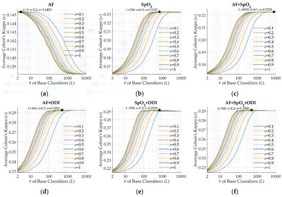 Performance in the training set of AdaBoost models as a function of the number of base classifiers (L) and the learning rate (ν), with their optimum values highlighted. (a) AF subset; (b) SpO2 subset; (c) AF + SpO2 subset; (d) AF + ODI subset; (e) SpO2 + ODI subset; (f) AF + SpO2 + ODI subset.