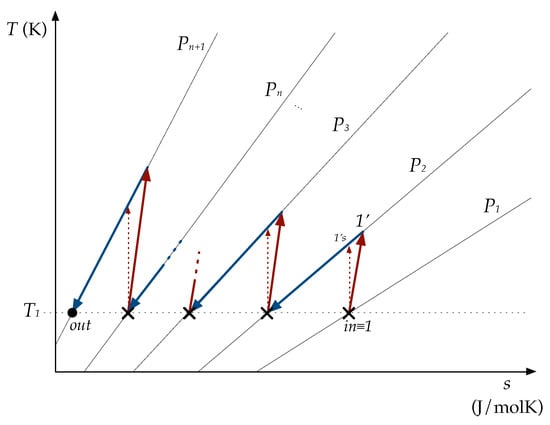 Schematic diagram of the process on a chart. The inlet is , indicated by ‘in’; the outlet is ‘out’. In between there are n compression stages—in red—and the corresponding aftercooling stages, in blue. Thus, after a compression-aftercooling sequence (indicated by ‘x’), the gas is at , but at a higher pressure each time.