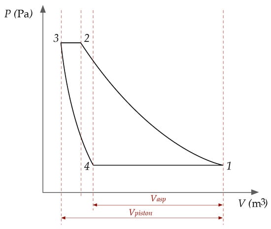 Complete cycle of a reciprocating compressor. The dead volume is . Process 1-2: compression. Process 2-3: discharge. Process 3-4: expansion. Process 4-1: aspiration.