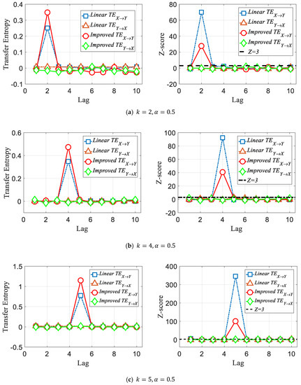 Demonstration that both methods identify the true lag values with maximal transfer entropy. The linear TE can only capture , corresponding to the highest transfer entropy value (Z-score indicates the value is above a significant level), while the improved TE method can detect and 5.