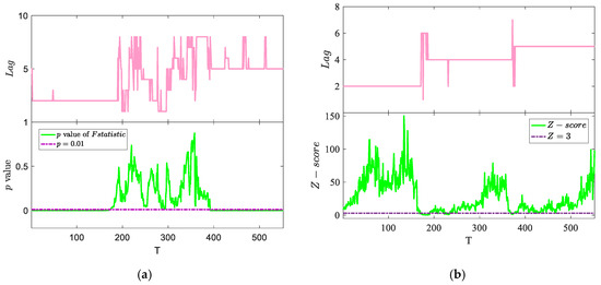 where is the residual sum of squares of Equation (16), is the residual sum of squares of Equation (17), is the number of observations, and is a lag value. We reject hypothesis H0 and accept that is a Granger cause of if and only if The model order can be determined by minimizing [36], defined as