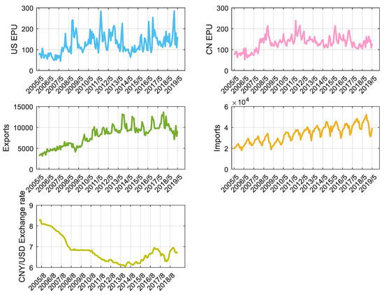 Time series of the US EPU index, the CN EPU index, US imports from China, US exports to China and the CNY/USD exchange rate.