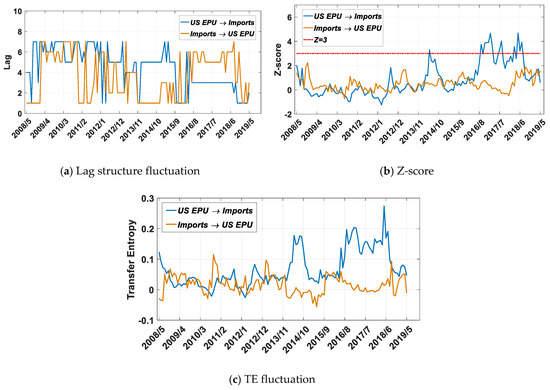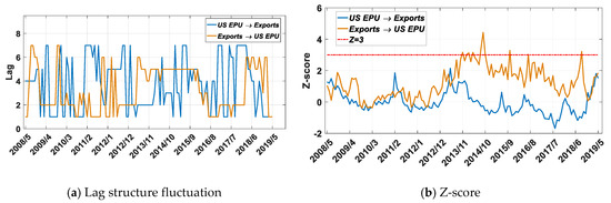 Based on the improved TE method, we analyze the information flow between EPU and US-China imports and exports. As shown in Figure 6a, there is an obvious dynamic order fluctuation in the correlation between EPU and US exports to China. As shown in Figure 6b, there are almost no regions with a Z-score higher than 3, which indicates that the US EPU has no significant impact on US exports to China.