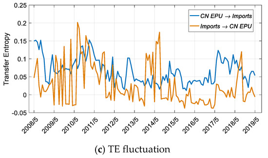 Figure 6c shows that before August 2013, the EPU’s transfer entropy to exports was higher than the impact of exports on EPU, but after 2013, the situation changed, and the impact of exports on EPU gradually exceeded the impact of EPU on exports. This result may be related to China’s emergence as the third largest exporter to the US in 2013, and the huge Chinese market affects the formulation of US economic policies. China is the fastest-growing export market for the US. In 2013, US exports to China reached USD 120 billion, second only to the US’s two trading partners in the North American Free Trade Zone, Canada and Mexico, making China the third largest exporter to the US. Our conclusions verify that since 2013, the US’s huge export trade to China has become an important engine for US economic growth, and US economic policy has begun to pay more attention to the issue of China’s export trade.