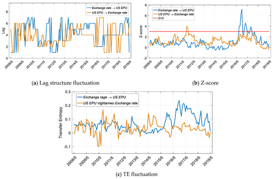 Results for transfer entropy between the US EPU and the exchange rate based on the improved TE method. The time period is from 1 May 2005 to 1 May 2019, and the sliding window length is 36 months, with a 1-month step size.