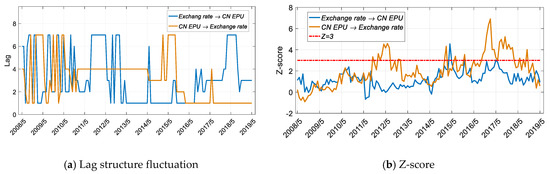 In the literature [42], Chen et al. concluded that there was an asymmetric impact of EPU on exchange rate volatility in China, and this analysis result was also verified in Figure 11b,c. However, [42] did not identify the specific time period for the asymmetric correlation between the policy and the exchange rate market, nor did it analyze the difference in the impact of China–US policy uncertainty on exchange rate fluctuations. As can be seen from Figure 11b, China’s economic policy had a significant impact on the exchange rate beginning in June 2016, with a leading order of one month (Figure 11a), and this influence tended to be nonsignificant after May 2018. In addition, in 2012, China’s economic policy had a significant impact on the exchange rate.