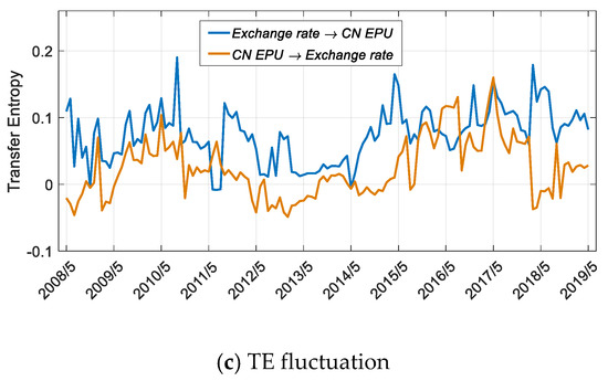Results for transfer entropy between the CN EPU and the exchange rate based on the improved TE method. The time period is from 1 May 2005 to 1 May 2019, and the sliding window length is 36 months, with a 1-month step size.