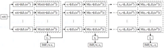 - Calculate . For , the first residue is obtained by , where denotes ith added white Gaussian noise with zero mean and unit variance, I is the predefined ensemble sizes denoting the number of added , and denotes the action of averaging throughout the realizations of .