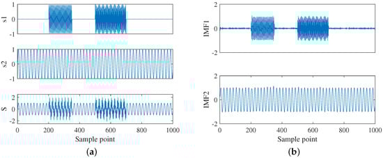 In this section, the performance of ICEEMDAN on an artificial signal will be analyzed. The signal was generated by Equation (12), where the number of sampling points of each signal was 1000 . and are the two source signals to be decomposed, are the cosine noise, are the mixed artificial signals, and denotes the white Gaussian noise with zero mean and unit variance.