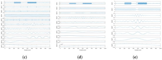 The effectiveness of the proposed feature extraction method is verified and demonstrated in this subsection. As shown in Figure 7, ICEEMDAN was used to decompose randomly selected experimental data to produce a group of IMFs with different center frequencies. For clarity, only the first ten IMFs are demonstrated. Figure 8 shows the MI of each IMF and the original signal, where the dashed line of the corresponding color represents the corresponding meanMI to distinguish the signal IMFs.