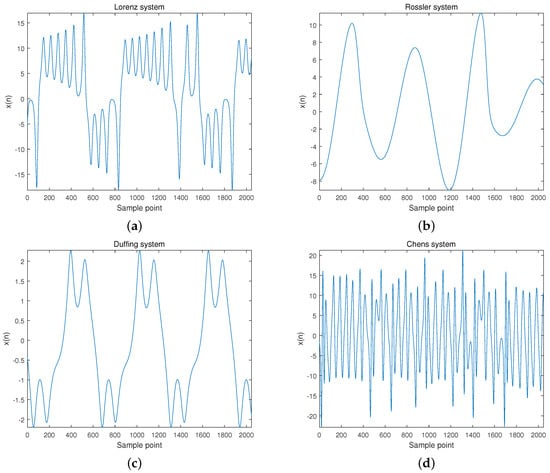 The random number generator was used to set the initial values of each chaotic system, and these equations were integrated by using a fourth-order Runge–Kutta method with a fixed step size of 0.01. The X component signal with a length of 2048 points was selected as the chaotic signal. The time-domain waveforms of Lorenz, Rossler, Duffing, and Chen are shown in Figure 4.
