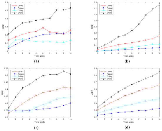 Entropy analysis results of chaotic systems: (a) multiscale sample entropy (MSE); (b) multiscale fuzzy entropy (MFE); (c) multiscale replacement entropy (MPE); and (d) multiscale improved permutation entropy (MIPE).