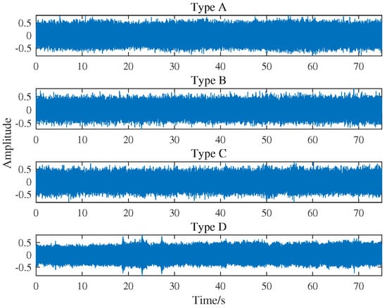 In this section, the proposed feature extraction algorithm is used to analyze the sound of actual power equipment. The audio data used in this paper came from four types of key power equipment measured in a power plant under the same conditions. Type A, B, C, and D respectively represent the feeder connecting shaft, induced fan blade, coal grinder, and circulating water pump. For each type of electrical equipment, we acquired 50 samples of 1.5 s duration. The sampling frequency of each sample is 16 kHz. The sound waveforms of four power equipment are shown in Figure 6.
