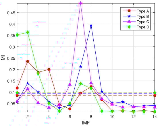 where and represent the probability density function of X and Y respectively, and denotes their joint probability density function. The mutual information is a measure of the correlation between two random variables []. If X and Y are independent, . Generally, the signal IMFs are more correlated with the original signal than the noise IMFs. Therefore, the mutual information can be used as an indicator to distinguish the signal IMFs from IMFs. The proposed method adopts the mean mutual information (meanMI) as a standard to compare the correlation between IMF and the original signal, which can be calculated as: