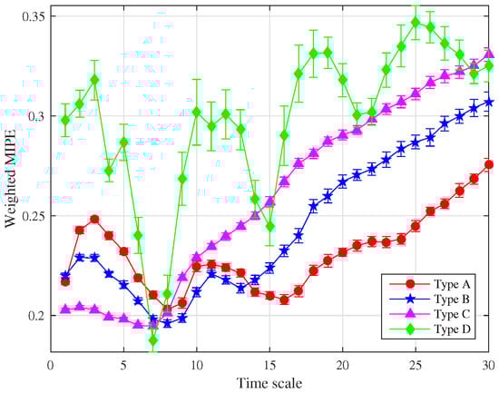 After eliminating the noise IMFs, the norMI and MIPE of each signal IMFs were calculated. Then norMI was used to weight the corresponding MIPE results. The weighted MIPE results took into account the importance of each signal IMFs. The multiscale MIPE results of the four power devices obtained through an average of 50 sets of experimental data are shown in Figure 9. The scale factor was selected as s = 1–30, and the error bars represent the SD of the weighted MIPE values.
