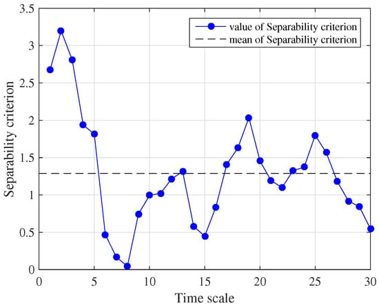 The separability criterion was used to analyze each dimension of the weighted MIPE results. The distribution of SC is shown in Figure 10, where the black dashed line represents the mean value of 30 SCs. For the separability criterion larger than the mean of separability criterion value, the feature can be defined as an effective one. Comparing Figure 9 with Figure 10, it can be seen that the separability criterion distribution had a positive correlation with the dispersion degree of the weighted MIPE result. The SC was large when these four types of weighted MIPE results were significantly different. Hence, it is obvious that the dimension reduction extraction based on the separability criterion is effective.