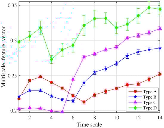 The multiscale entropy feature vector was obtained after the feature dimension reduction, as shown in Figure 11. For different types of running power equipment sound, the entropy feature vectors are clearly different, indicating that the extracted features are effective for power equipment classification. Moreover, the error bar on each scale factor is low, proving the reliability of the proposed method.