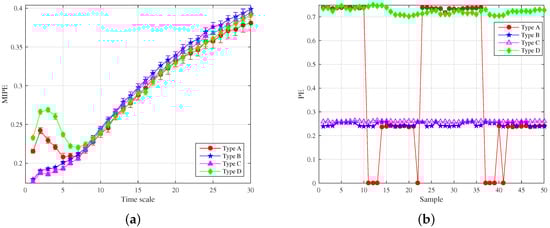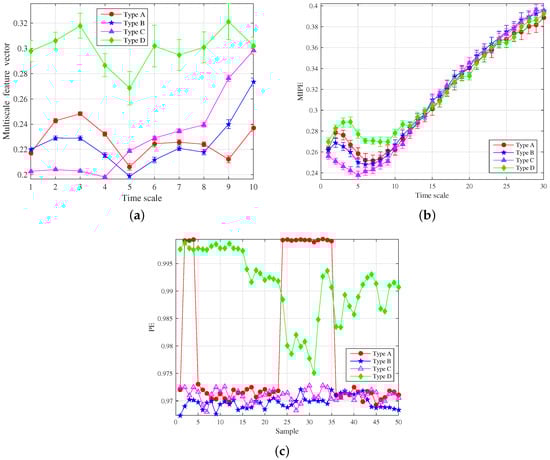 For comparison, the same experimental data were analyzed using the feature extraction method in [,]. The feature extraction results of MIPE [] are shown in Figure 12a, where the mean value of IPE and its standard deviation error is drawn. The IPE values of type B and C overlap in contrast with that in Figure 11. In particular, the IPE values of the four types of signals all overlap and are difficult to distinguish when . The reason lies in the lack of noise elimination before the MIPE calculation, and the results are influenced by the noise, which becomes larger with the coarse-graining process. The analysis results of CEEMDAN-PE [] are demonstrated in Figure 12b, where the abscissa represents the different types of samples and the ordinate represents the PE value. The parameters of the algorithm were set as same as those in []. Because CEEMDAN-PE was based on a single scale, the relationship between entropy and time scale was discarded. It can be seen from Figure 12b that the PE values of type B and type C are close to each other. The results of type A overlap with those of other types, making them difficult to be distinguished.