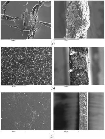 Scanning electron microscopy (SEM) images of the surface (left) and cross section (right) of the membranes used in this work (Spanish National Centre for Electron Microscopy, ICTS). (a) CR67; (b) MK40; (c) NF117.