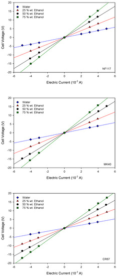 Current–voltage curves were obtained for the different studied membranes. The results are shown in Figure 3.