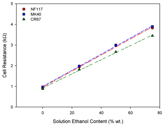 The cell resistance linearly increased with the percentage of ethanol in the solution for the three membranes, probably due to a larger solution contribution to the total value. Lower values and less influence of the ethanol percentage in the solvent was observed with the more porous CR67 membrane.