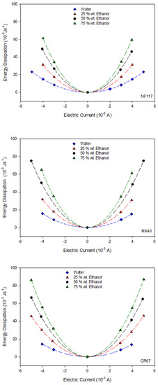 From the cell resistance values, the dissipation energy due to the Joule effect can be estimated using Equation (11) for the three membrane systems. Figure 5 shows the energy dissipated as a function of both the applied electric current and the ethanol content of the solutions. Regardless of the membrane system, a similar behavior is observed such that the dissipated energy increases with both the electric current and the ethanol content (cell resistance).