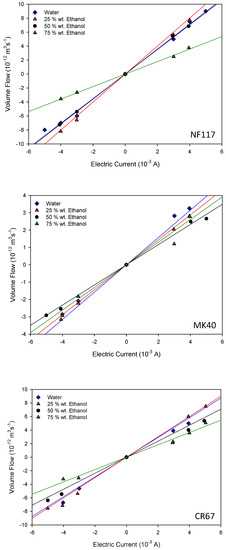 Following the method described in Section 3, the volume changes in the cathodic and anodic compartments were measured at different electric currents for all the membrane systems. Figure 6 shows the measured electro-osmotic flows as a function of the applied electric current for the different membrane systems. A similar behavior was observed in all the studied systems. After applying the electric current, a linear dependence was found between the volume change and time when the stationary state was reached. Thus, the volume flow could be estimated from the slope of the corresponding straight lines. From data in Figure 6, the values of the apparent electro-osmotic permeability W can be estimated using Equation (14).