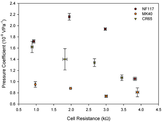 CR67 membrane showed larger pressure coefficients than MK40 membrane, in agreement with its larger liquid uptake. This different behavior observed for the different membranes may be due to their morphological differences since the electric properties are similar, as shown in Figure 4. Liquid uptake seems to have less influence in the pressure coefficient of highly cross-linked membranes than in non-cross linked membranes.