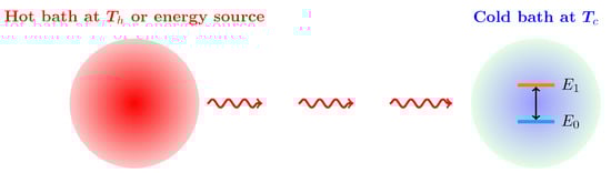 As an application of quantum thermodynamics of open quantum systems presented in Section 2, we first consider a two-level quantum system which is in contact with a cold bath at temperature and driven by repeated photon pulses, as depicted in Figure 1. The hot thermal bath supplying energy does not have direct contact with the quantum system. Its role is here replaced by a sequence of photon pulses to the two-level system. We examine how the two-level system absorbs and dissipates energy and generates entropy during this process in order to gain insight into the nonequilibrium dynamics due to photon pulses.