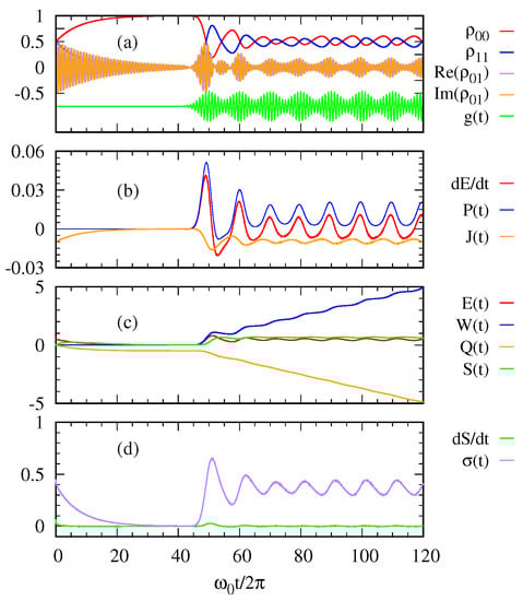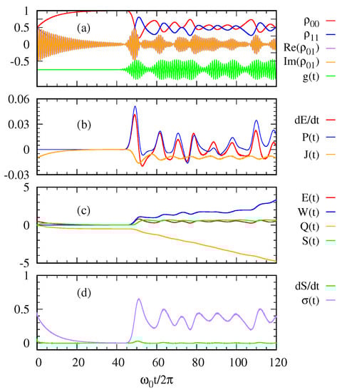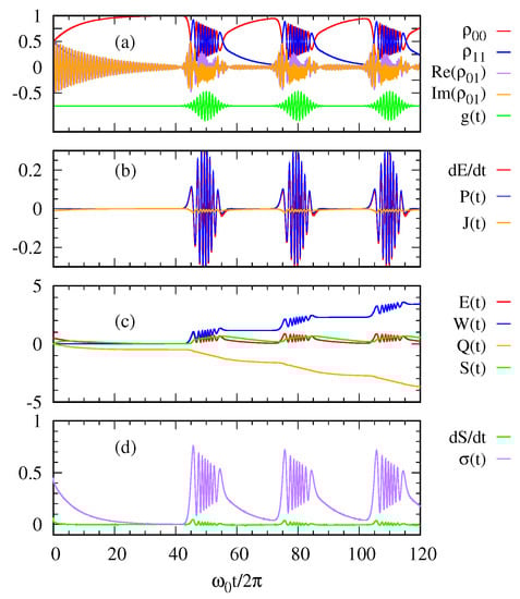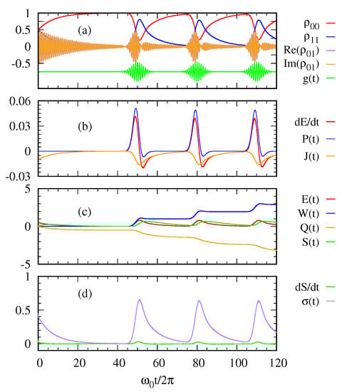 With regard to the first law of quantum thermodynamics, Figure 2b plots the rate of energy change, the power, and the heat current. The heat current from the environment to the system is always negative. This means the excited state of the two-level system releases its energy to the cold bath. In contrast, the power and oscillate out of phase while the photon pulse is applied. Figure 2c shows the entropy of the two-level system together with its energy , the work done on the system and the heat transfer . Figure 2d shows the entropy production as a function of time in relation to the second law of thermodynamics. The entropy production is always positive confirming the second law.