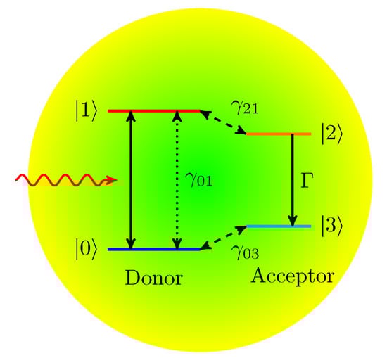 where and . Same as Equation (17), the interaction of the donor of the quantum photocell with the cold thermal bath is represented by the Lindblad operator,