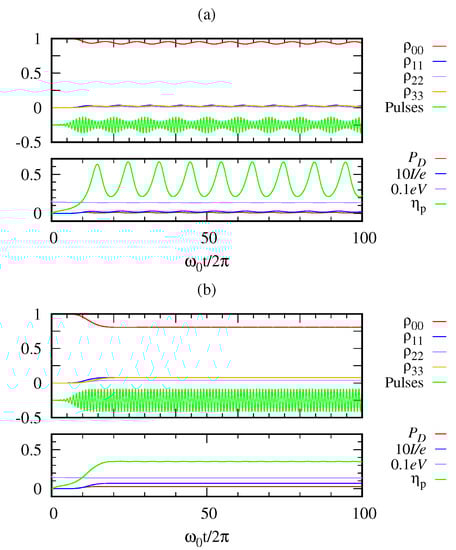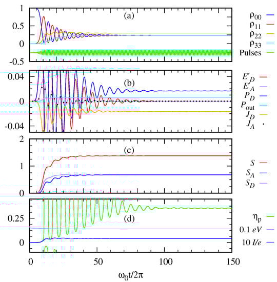 We solve numerically the LGKS Equation (26) using the Runge-Kutta method for different sequences of photon pulses to obtain the quantum thermodynamic quantities. Figure 7a plots the population of each level of the quantum photocell as a function of dimensionless time when the sequences of the Gaussian pulses are applied one immediately after another almost in a continuum limit. Figure 7b shows the change in energies of the donor and acceptor, and , the power delivered to the donor by the photon, the power output , the heat dissipation at the donor and the acceptor, and . Note that becomes equal to in the steady state. The heat dissipation of the donor is mainly associated with the transfer of electrons from the donor to the acceptor. The heat flow from the donor to the environment is relatively small because the decay rate to the environment is much smaller than the electron transfer rate from the donor to the acceptor. We note that only the fraction of the transferred heat energy is converted to the power output . mainly plays the role of populating the acceptor level 2, which generates the acceptor current for power output as indicated by Equation (32). It would be interesting to see whether the coherent transfer between the donor and the acceptor may give rise to a different result.