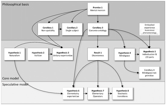 This paper is structured as follows (see Figure 1). The fundamental Premise 1 (Section 2.1) is mental monism, with three corollaries: (1) that consciousness is non-spatial; (2) that there is at most one subject; (3) that all concrete entities in the model must be experientiable. (Premise 1, and corollaries 1 and 2, are taken from an earlier paper [5], Corollary 3 is new). A result drawn from this is that (Section 2.2) the mental world is discrete. The eight Hypotheses for formal modelling (Section 3) are as follows: Section 3.1 that the mental world follows natural laws; Section 3.2 that it includes free will; Section 3.3 that it is built up from mental primitives (‘experientiae’) each of which is both experiential and volitional; Section 3.4 that mental space is built up from those primitives; Section 3.5 that mental individuation and intercommunication can be understood in terms of those primitives; Section 3.6 that the mental world is built up from a small palette of experiences; Section 3.7 that a minimal set of operators apply to the experientiae; and Section 3.8 that the experientiae transition stochastically. The first five Hypotheses form a core that I propose should apply to any formal model of consciousness within mental monism, while the last three are more speculative.