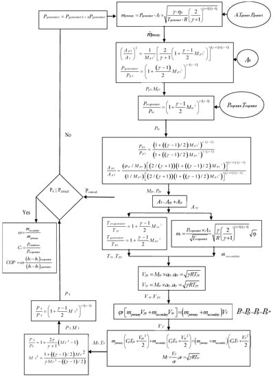 The thermodynamic model of the ejector is presented in the flow chart given in