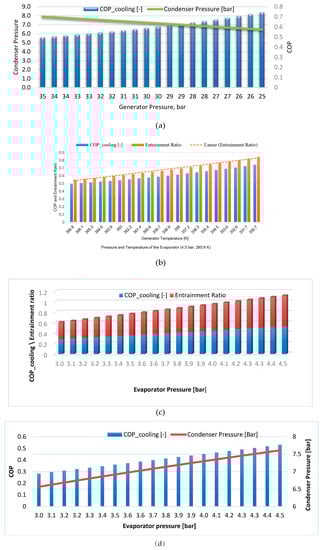 COP and entrainment ratio is given at a constant pressure and temperature within the generator, 33 bar and 363.9 K, respectively. These figures depict the effect on the