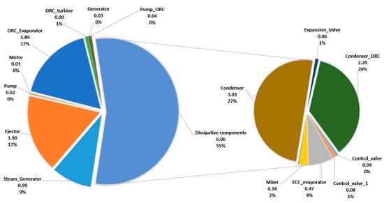 The results obtained from the exergetic analysis indicate that the condensers (of the ERC and the ORC, both are dissipative components) have higher exergy destruction values, followed by the ejector in the ERC, the ORC evaporator, and the steam generator, as shown in