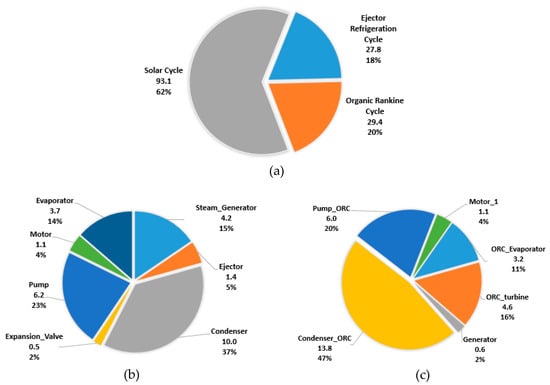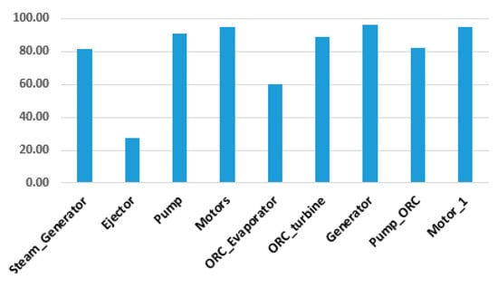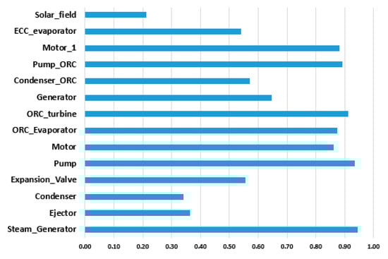 Figure 5). The operation conditions of the condenser have the most substantial influence on the destruction of exergy and the overall system. The highest exergetic efficiency is in the case of generator, pumps, and motors, while the lowest exergetic efficiency is in the case of the ejector and the solar field. The exergetic efficiency of productive components, except the ejector, is quite high. The total exergetic efficiency of the overall system is around 20%.