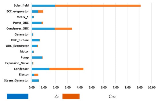 Cost balances (and, if required, the auxiliary equations) were formulated for each system component. Cost rates associated with exergy destruction (ĊD,k) and exergoeconomic factors (fk) were calculated.