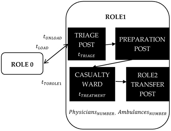 Having described the ROLE1 structure parameters and the method by which operational medical treatment is executed up to ROLE2, the optimization problem is formalized as follows: finding variants of ROLE1 structure parameters that satisfy the requirement of having a maximum of 2 h between the casualty’s introduction and the moment when a patient is ready for transportation to ROLE2.