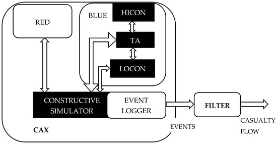 18]. This is an entity-level constructive simulation with the capacity to simulate and visualize the movements of even a single soldier. However, when the units are in formation, meaning inside vehicles, which is most of the time, the effects on individuals are not counted. Therefore, there is no casualty directly counted for a single soldier. To overcome this issue, the events generated by OneSAF, related to vehicle damage, are translated into the flow of casualties implemented in the filter.